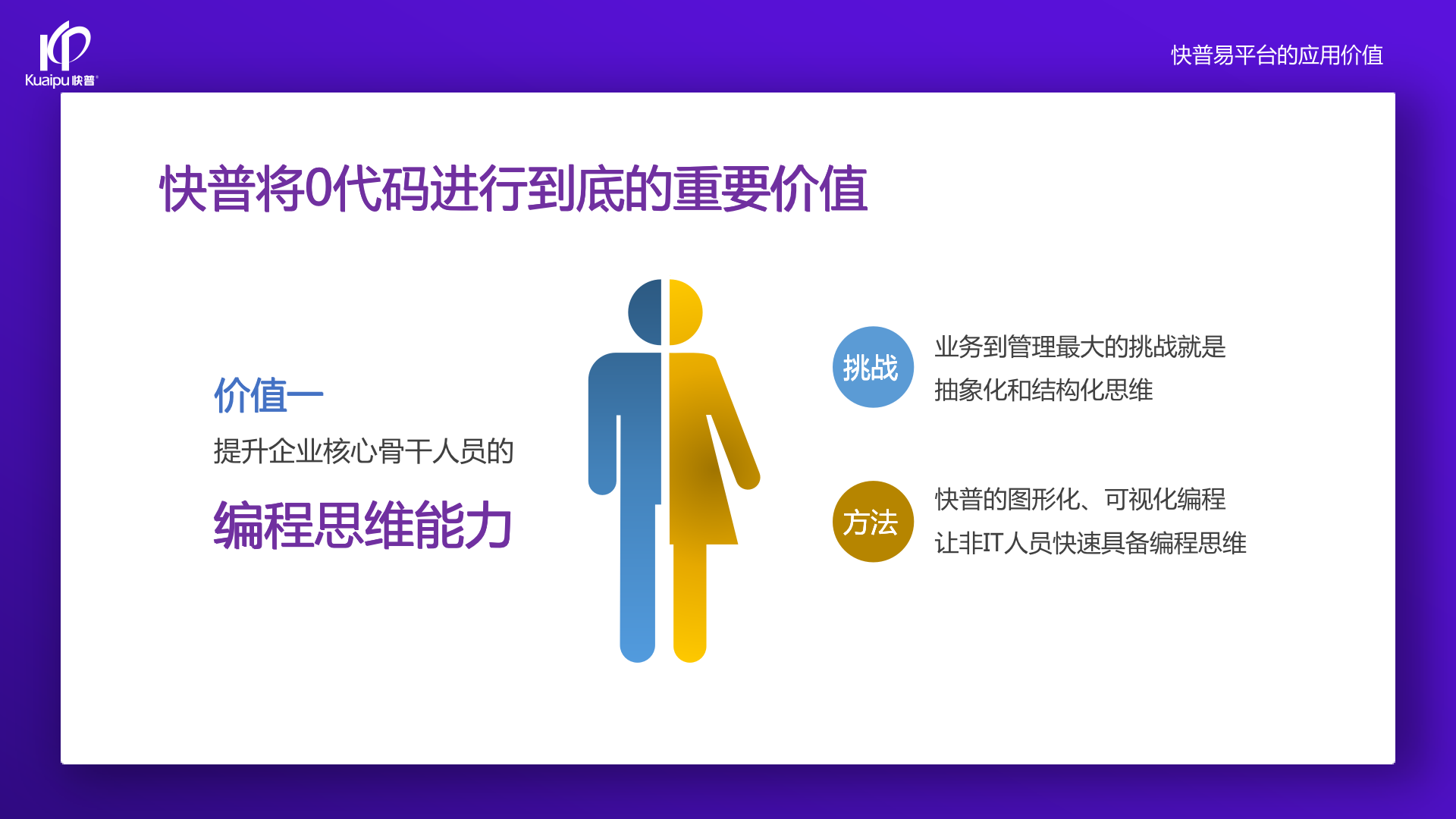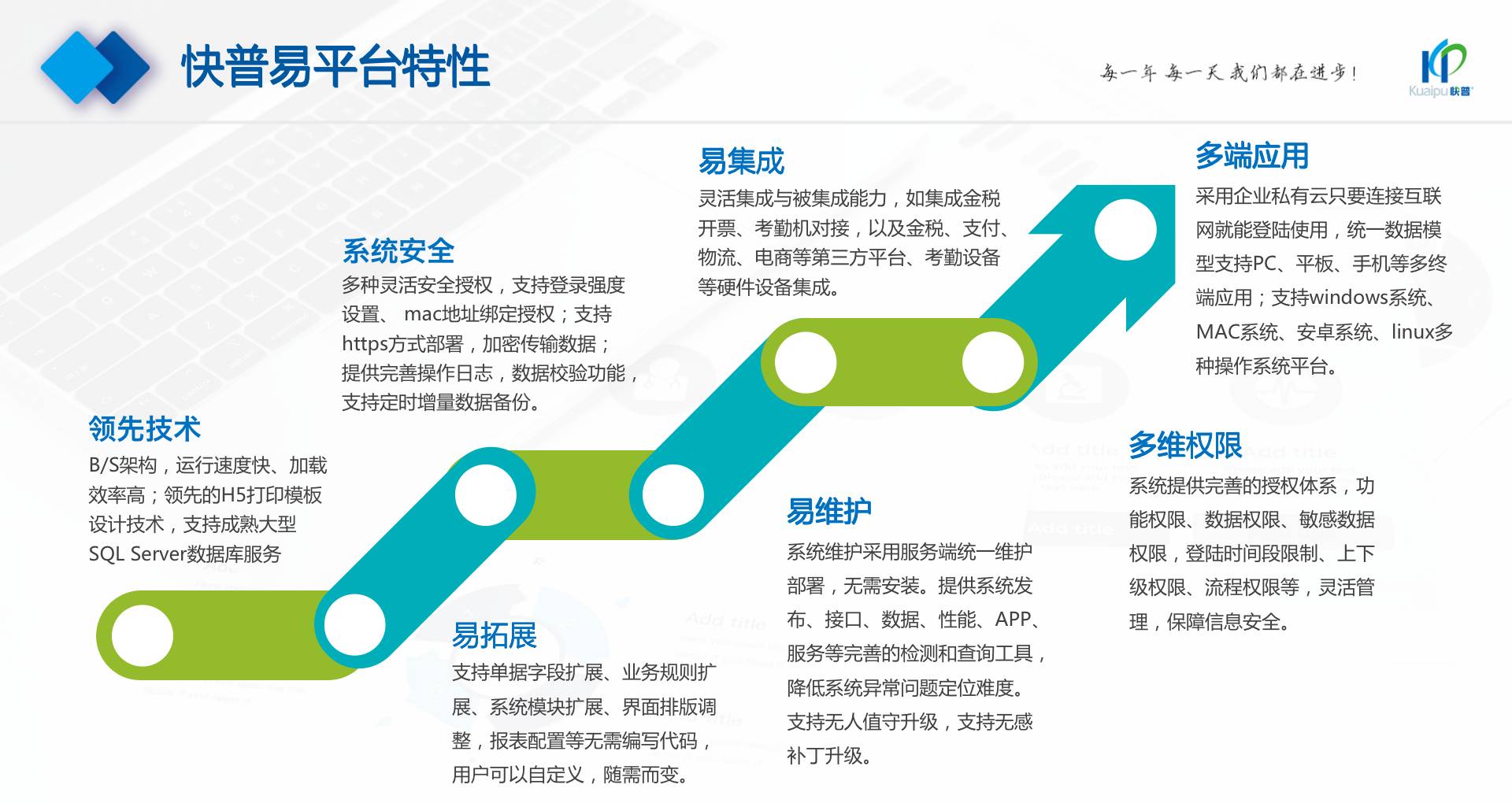 為了解決市場(chǎng)需求與平臺(tái)產(chǎn)品瓶頸等矛盾,實(shí)現(xiàn)徹底的零代碼平臺(tái),快普?qǐng)?jiān)持理念創(chuàng)新,以理念推動(dòng)平臺(tái)技術(shù)的創(chuàng)新?!耙圆蛔儜?yīng)萬(wàn)變”的理念:分析哪些東西未來(lái)肯定不變?哪些趨勢(shì)未來(lái)一定會(huì)變?從變化中找出不變的因素,從不變中找出變動(dòng)的因素;從量變到質(zhì)變,經(jīng)歷萬(wàn)變總結(jié)抽象出不變的本質(zhì)?;诳炱臻L(zhǎng)期的信息化服務(wù)經(jīng)驗(yàn),開(kāi)發(fā)配置出企業(yè)數(shù)字化轉(zhuǎn)型工具:快普易平臺(tái)成功解決了企業(yè)數(shù)字化轉(zhuǎn)型升級(jí)面臨的客戶大量個(gè)性化需求,真正實(shí)現(xiàn)隨需而變的設(shè)計(jì)理念,大大降低了信息化投入成本,提高信息化效率,幫助企業(yè)實(shí)現(xiàn)自主可控的技術(shù)創(chuàng)新,從而進(jìn)一步推動(dòng)企業(yè)的業(yè)務(wù)創(chuàng)新和管理創(chuàng)新。