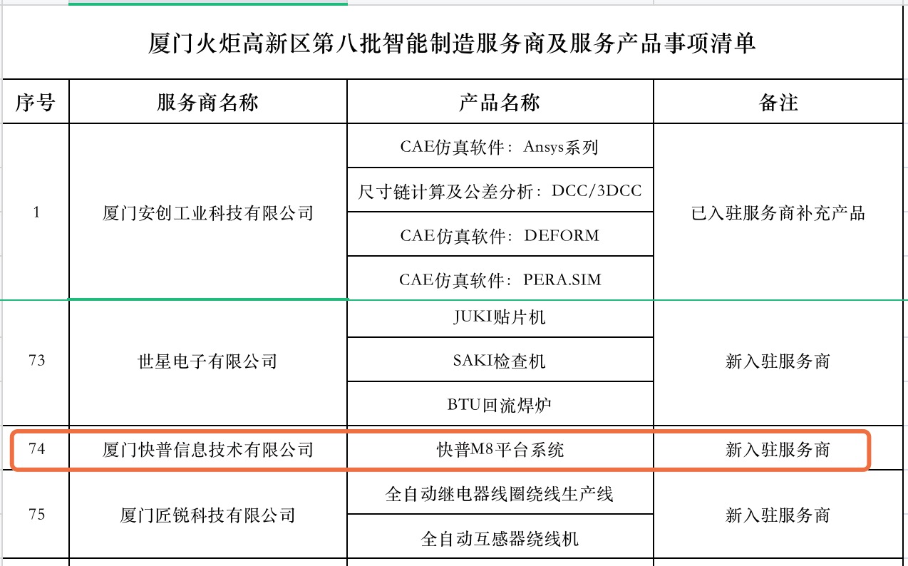 近日,廈門火炬高新區(qū)管委會公布第八批“火炬智能制造服務商”和“智能制造產(chǎn)品服務”,經(jīng)服務機構申報、運營單位初審、業(yè)務處室復審、專家組評審等環(huán)節(jié),廈門快普信息技術有限公司及自主研發(fā)產(chǎn)品“快普M8平臺系統(tǒng)”正式入選。