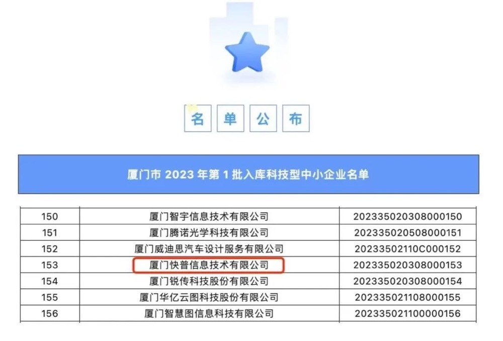 繼“廈門市創(chuàng)新型中小企業(yè)”認(rèn)定后,快普再傳捷報!近日,廈門市科技局發(fā)布了《2023年第一批入庫科技型中小企業(yè)名單》,快普赫然在列。該項評定意味著快普的技術(shù)成果、科技含量、創(chuàng)新能力等方面獲得了政府相關(guān)部門的充分肯定,同時也表明快普在科技創(chuàng)新、技術(shù)研發(fā)和知識產(chǎn)權(quán)保護方面邁上了一個新的臺階。