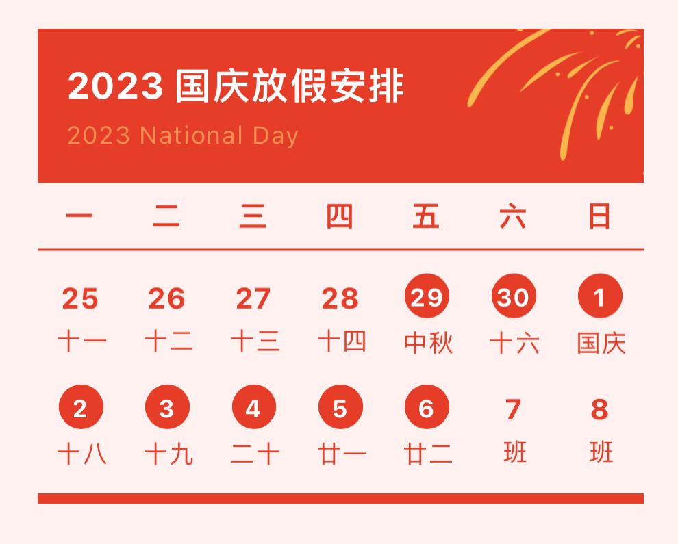 1、放假時間:2023年9月29日(周五)至2023年10月6日(周五)放假調休,共8天。