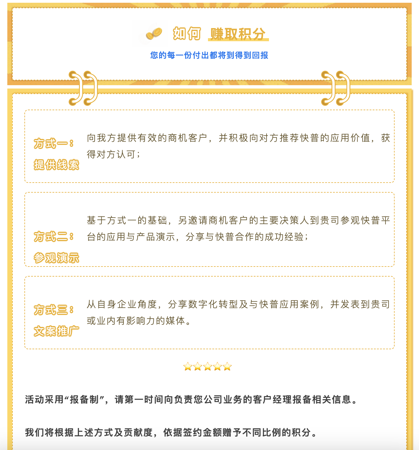 為進一步回饋老用戶的貢獻,現(xiàn)誠邀您參與“快普感恩回饋大行動!”,與我們共享數(shù)字經(jīng)濟發(fā)展的紅利!通過主動推薦、轉(zhuǎn)介紹客戶,您將獲取豐厚的積分返利,讓您的每一份付出都得到實質(zhì)性的回報,人脈資源也可以獲得變現(xiàn)!