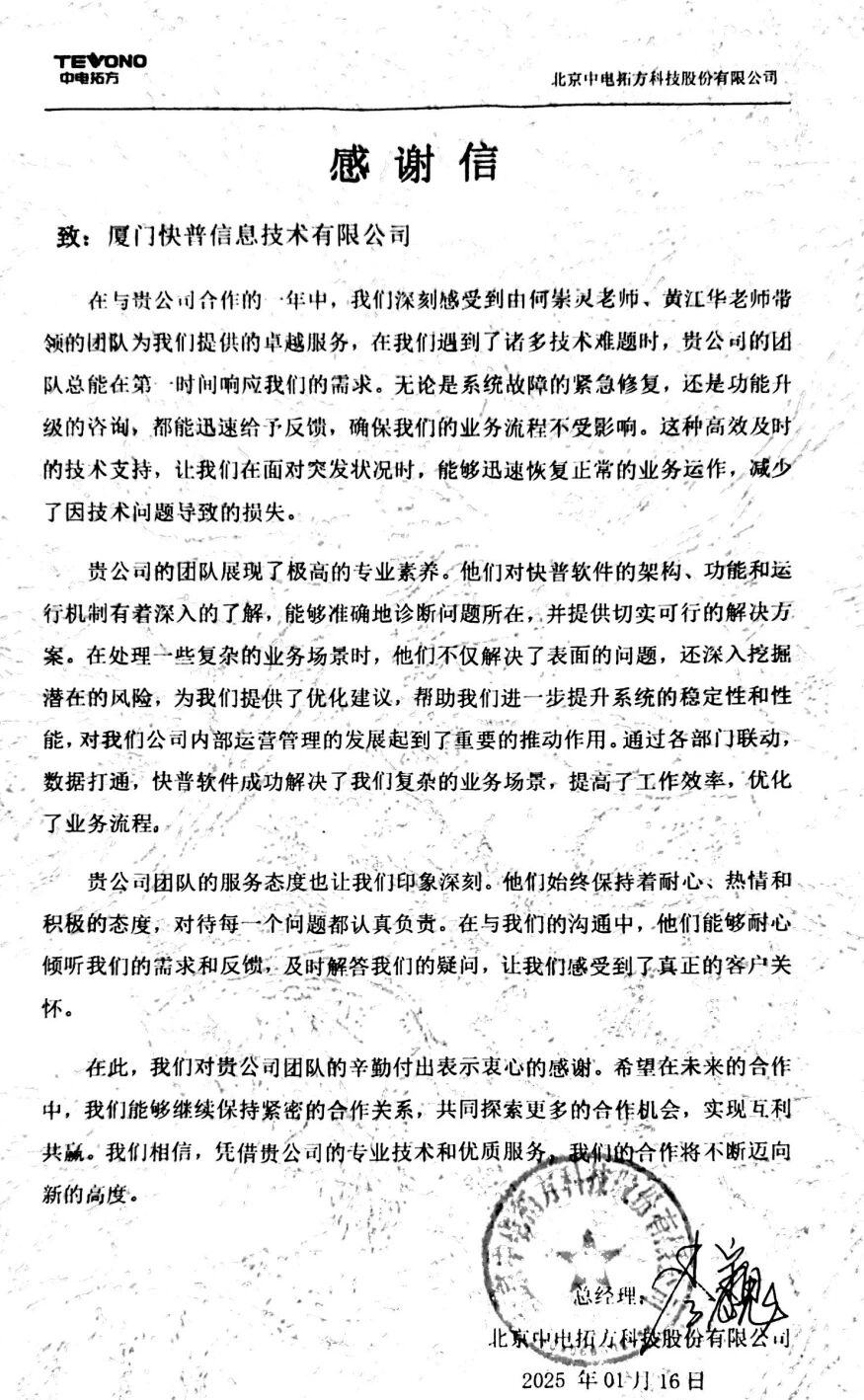 【快普簡訊】 北京中電拓方科技股份有限公司向我司發(fā)來感謝信,對何崇靈老師、黃江華老師帶領(lǐng)的實施小組在過去一年中提供的優(yōu)質(zhì)服務(wù)表示高度認(rèn)可和衷心感謝。來信不僅是對快普實施團(tuán)隊專業(yè)能力的肯定,更是對快普“客戶至上”服務(wù)理念的詮釋。